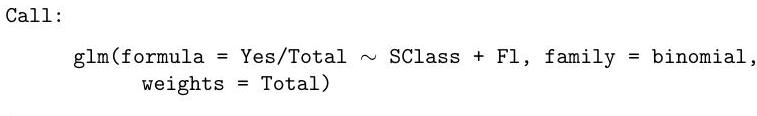 A (slightly edited) version of the R output is given below. Explain carefully what model is being fitted, whether it does actually fit, and what the parameter estimates and Std. Errors are telling you. (You may assume that the factors SClass (social class) and Fl (with/without) have been correctly set up.)