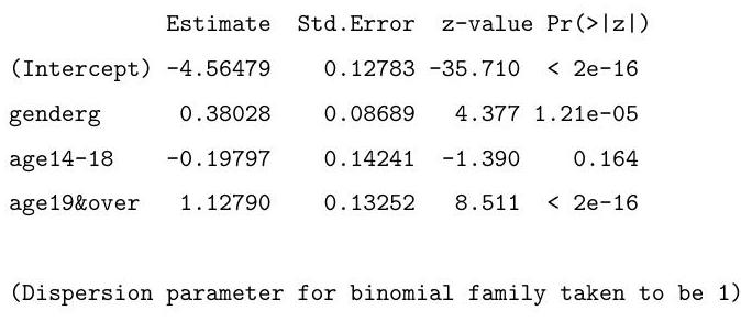 >summary(glm(s/r∼ gender + age, binomial, weights =r))